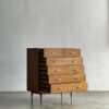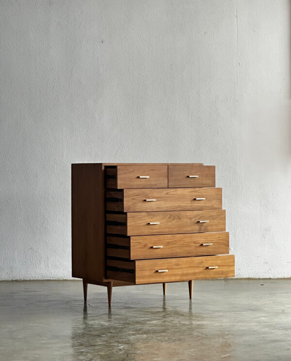 Keunggulan utama kabinet ini terletak pada kualitas bahan premium dan proses produksi handmade, memastikan setiap unit memiliki karakter unik. Desain minimalis retro membuatnya timeless dan mudah dipadukan dengan berbagai gaya interior — dari skandinavia, japandi, hingga klasik tropis. Struktur kokoh, detail presisi, dan penyimpanan lima laci menjadikannya solusi fungsional sekaligus dekoratif.