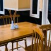 Kursi makan minimalis dari kayu jati dengan sandaran salur vertikal, finishing natural doff, handmade Jepara. Kuat, elegan, dan cocok untuk berbagai ruang makan.
