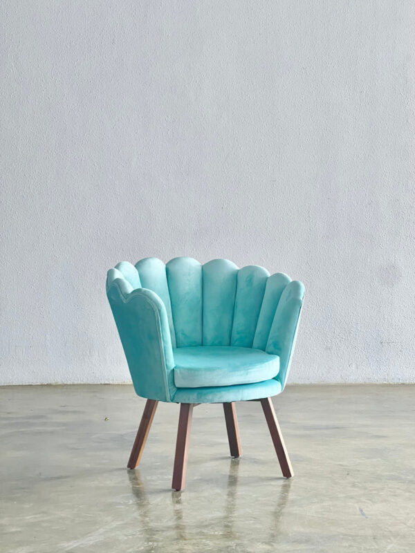 Kursi aksen bergaya kerang dengan dudukan velvet biru dan kaki kayu jati natural. Ideal untuk ruangan bergaya elegan dan nyaman digunakan sehari-hari.
