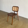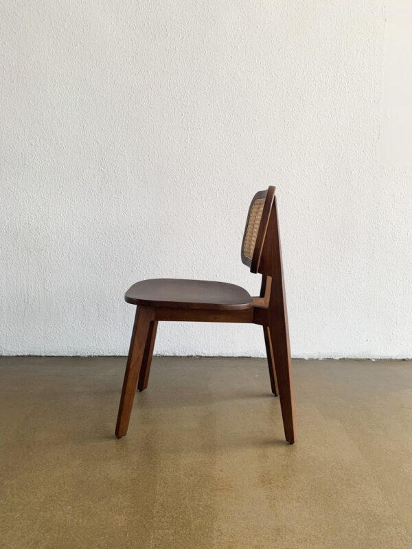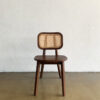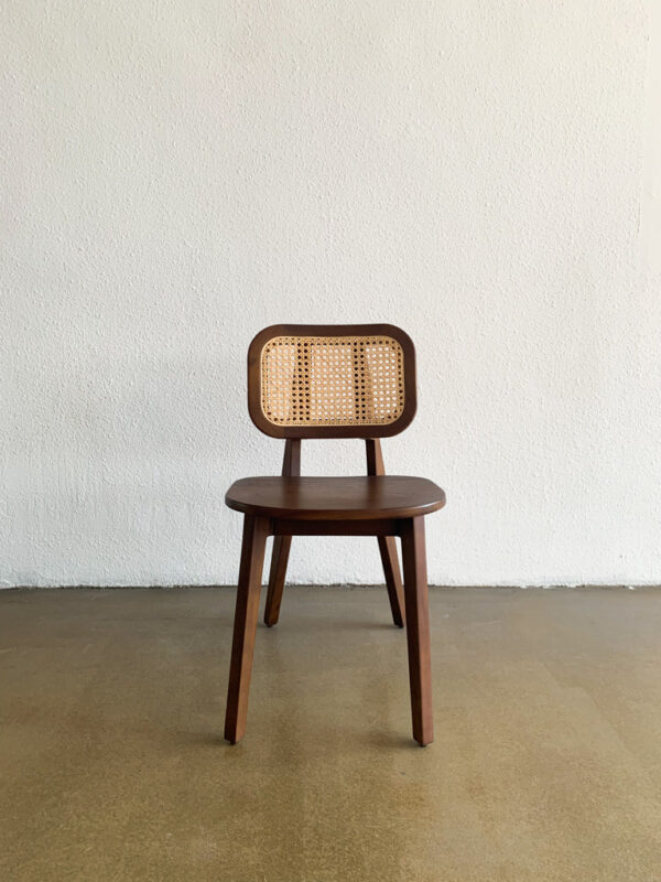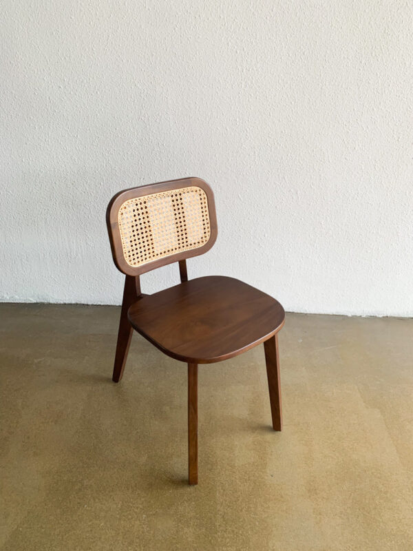 Kursi kayu jati retro bergaya minimalis dengan sandaran rotan anyam. Finishing walnut doff, tampilan estetik dan ringan, cocok untuk interior vintage atau natural modern.
