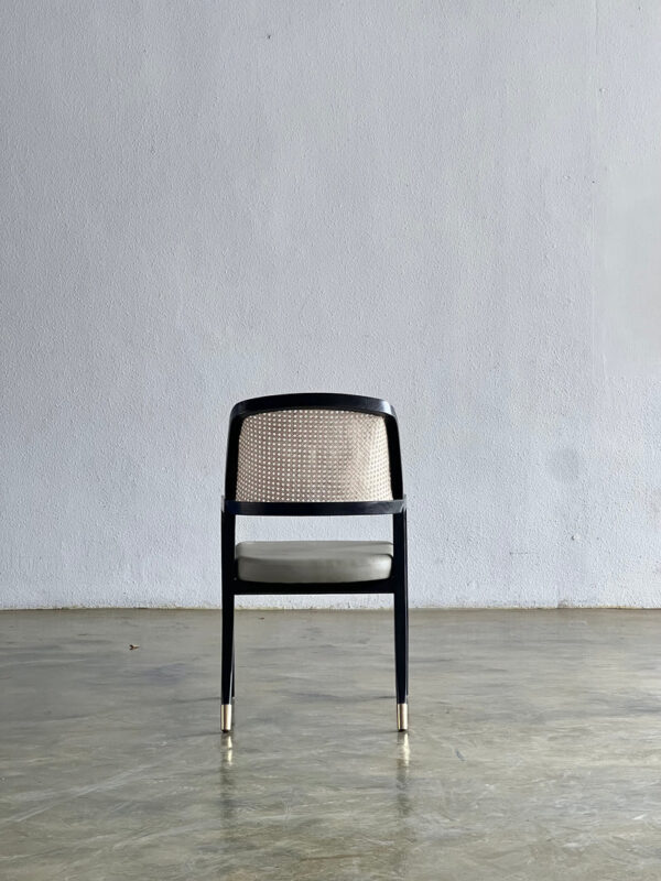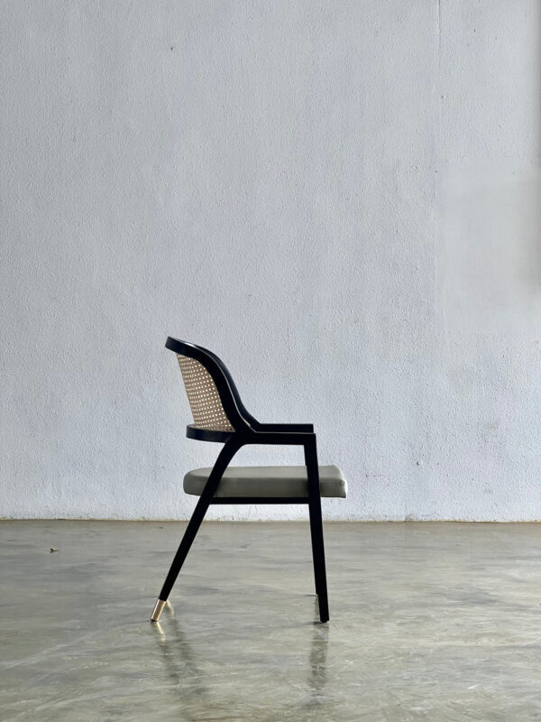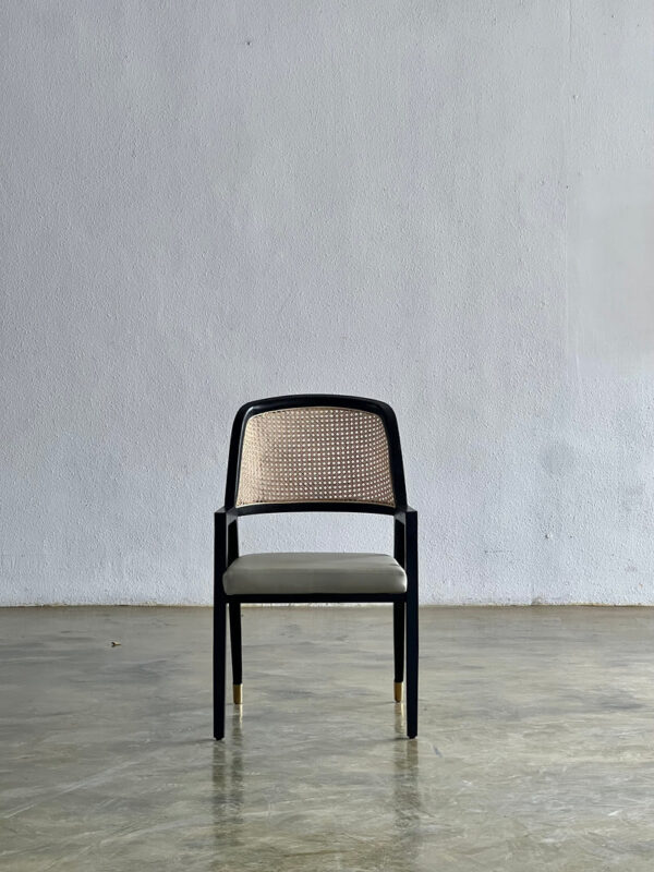 Selain itu, kaki kursi dilengkapi aksen kuningan tertutup yang menambah sentuhan eksklusif pada tampilannya.