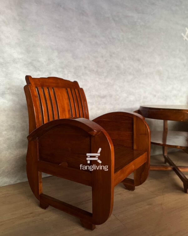 Kursi teras ini dirancang oleh pengrajin Jepara berpengalaman dengan ketelitian tinggi. Sentuhan handmade dan penggunaan bahan jati asli memberikan nilai tambah pada estetika dan daya tahan. Selain itu, finishing gloss memperkuat kesan elegan dan memperlihatkan serat alami kayu jati yang menawan.