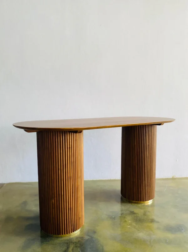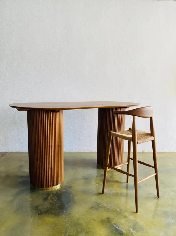 Selain tampilannya yang menawan, meja bar kaki salur ini juga unggul dalam hal fungsionalitas. Desain kakinya yang berbentuk salur tidak hanya memperkuat struktur tetapi juga memberikan karakter unik yang jarang ditemui. Karena itu, produk ini sangat cocok bagi Anda yang mengutamakan estetika sekaligus keawetan furnitur. Kombinasi jati dan besi menciptakan kesan maskulin, elegan, dan tetap hangat berkat warna natural kayunya.