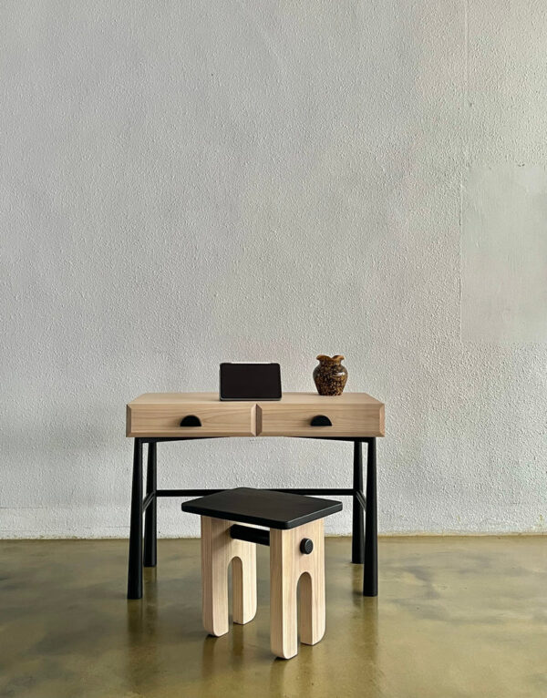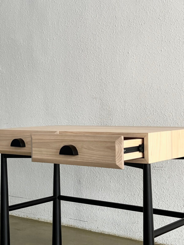 Dimensi: 100 x 52 x 76 cm (P x L x T) Panjang dan finishing meja dalam gambar masing-masing adalah L100 cm dan Finishing Kaki Sungkai/Hitam Matte yang Diputihkan.