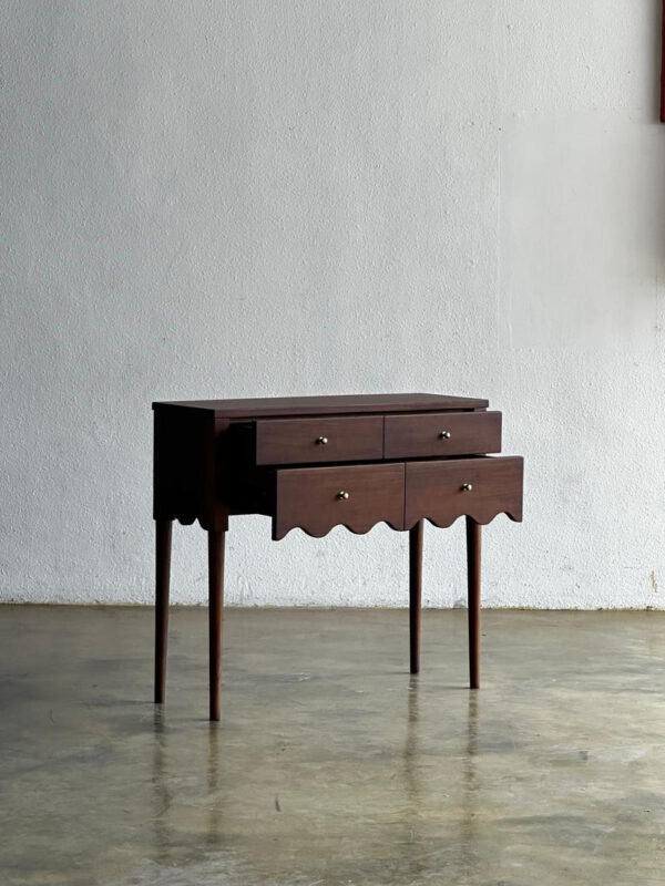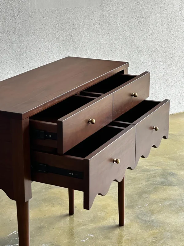 Karena dilengkapi empat laci besar, meja konsul klasik ini sangat praktis untuk menyimpan dokumen, kunci, atau barang dekoratif. Terlebih lagi, desainnya cocok untuk memperindah ruang tamu, lorong rumah, maupun area foyer tanpa terlihat berlebihan. Bentuk kaki meja yang kokoh menambah kesan seimbang pada keseluruhan tampilannya.