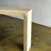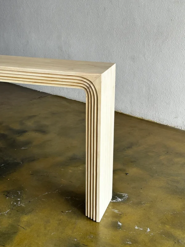 Meja konsul minimalis salur dari kayu jati solid dengan desain simetris dan finishing natural. Cocok untuk foyer, lorong, atau ruang tamu modern.