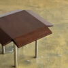 Meja minimalis modern dengan perpaduan kaki stainless dan kayu jati solid warna dark walnut. Handmade Jepara dengan desain elegan dan tahan lama.